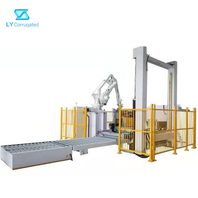 1, 다음을 포함하는 로봇 팰리타이저 시스템 표준 전직선 : 자동차 롤러 콘베이어가 기기를 짜내 위치 결정 장치, 로봇 팔, 자동차 팔레트 연료실, 페이퍼 시트 장치 보관, 자동차 팔레트를 번들링합니다